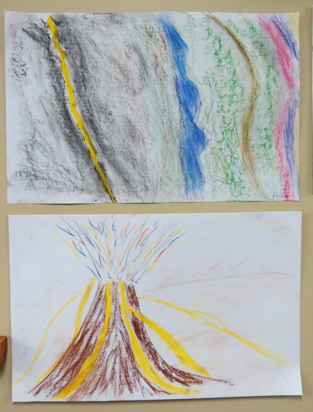 On Saturday morning, Sam read John 10: 11 – 18 using the Lectio Divina approach. This consists of reading the passage three times. After the first reading, listeners are asked to describe one word that made an impression on them. After the second reading, listeners are asked to discuss a phrase to illustrate how it connects with their lives. After the third reading, listeners are asked how the passage influenced or defined their relationship with God. The objective is to go beyond analysis and instead rely on emotion when creating a work of art. I heard the word “shepherd” many times and understood that one does not need to be afraid. The word “shepherd” strongly reminded me of my favourite Psalm, Psalm 23, and the phrases regarding pastures and still waters. I made a chalk drawing depicting my revised relationship with God based on my “analytical/creative” leap from John 10: 11 – 18 to Psalm 23 to illustrate how the volcano flowed in a curve through a field and still waters towards a shepherd’s crook and a horizontal band of bright stripes of different colours representing God. Sam then read Isaiah 40:21-21 using the Lectio Divina approach. My main impressions regarding this reading were that “He sits above the circle of the earth” and “The weak who believe in God will become strong.”